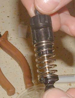 Rozbieramy amortyzator: ściągamy sprężynę i wszystkie elementy plastikowe.
